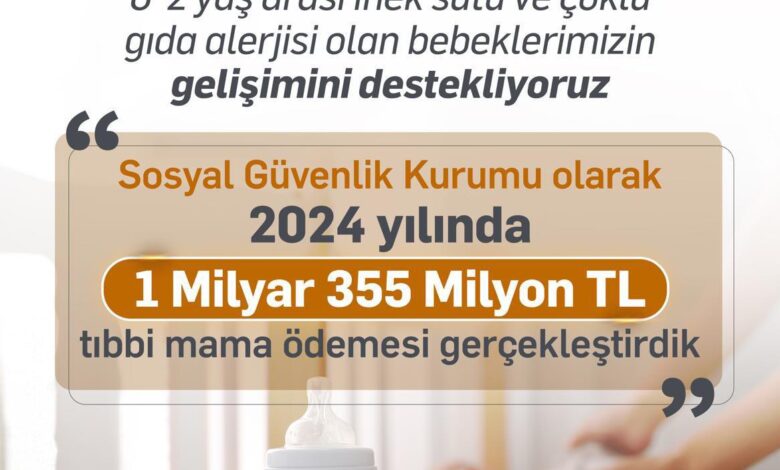Çalışma ve Sosyal Güvenlik Bakanı Vedat Işıkhan, 0-2 yaş arasındaki inek sütü ve çoklu gıda alerjisi olan bebeklerin gelişimini desteklemek amacıyla Sosyal Güvenlik Kurumu’nun (SGK) 2025 yılı için 1,3 milyar lira tıbbi mama ödemesi gerçekleştirdiğini açıkladı.
