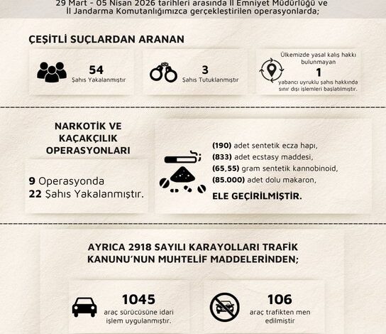 Çeşitli suçlardan aranan şahıslara yönelik yürütülen çalışmalarda toplam 54 şahıs yakalanarak adalete teslim edildi. Adli makamlara sevk edilen bu şahıslardan 3’ü tutuklanarak cezaevine gönderildi. Ayrıca, Türkiye’de yasal kalış hakkı bulunmadığı tespit edilen 1 yabancı uyruklu şahıs hakkında sınır dışı işlemleri başlatıldı.