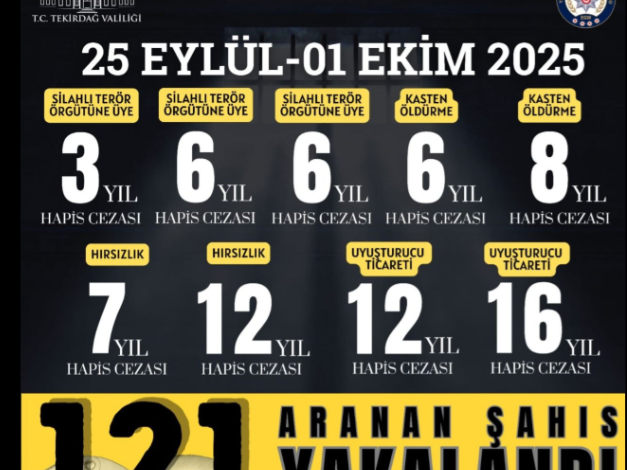 Tekirdağ’da polis ekipleri, il genelinde gerçekleştirdikleri denetim ve operasyonlarda firari hükümlüler ve çeşitli suçlardan aranan şüphelilere göz açtırmadı. Bir hafta süren çalışmalarda 121 kişi yakalanırken, 31 şüpheli çıkarıldıkları mahkemece tutuklanarak cezaevine gönderildi.